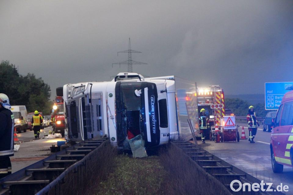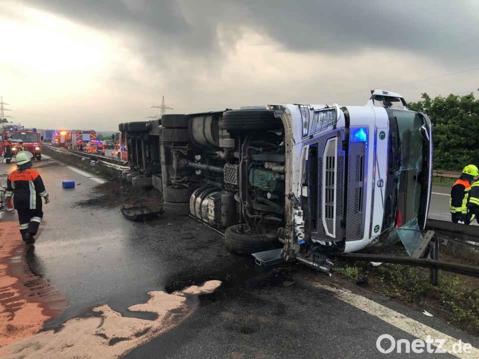 Laut Aussage eines Zeugen kam der Fahrer des Sattelzuges aus nicht nachvollziehbarer Ursache von der rechten auf die linke Spur. Bei dem Versuch gegenzulenken schaukelte der Zug sich auf, schlingerte mehrmals nach rechts und links, kollidierte mit einem auf der linken Spur fahrenden Pkw und kippte schließlich um. Der 26-jährige Pkw-Fahrer und sein Beifahrer kamen mit dem Schrecken davon. Der Lkw-Fahrer wurde leicht verletzt und kam in ein Krankenhaus in Regensburg.