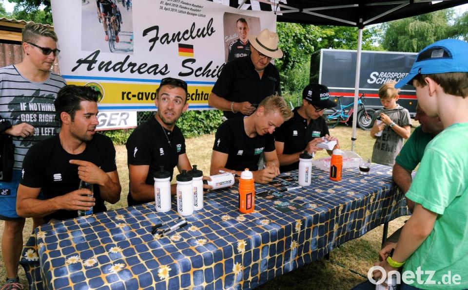Vier Spitzensportler des Radsports - Andreas Schillinger, Pascal Ackermann, Rüdiger Selig und Michael Schwarzmann, alle vier sind weltweit für das "bora-hansgrohe-Radsport-Team" aus Raubling bei Rosenheim unterwegs - hatten am Samstag alle Hände voll zu tun, um Autogrammwünsche zu erfüllen, seien es Unterschriften auf Trikots oder die zahlreichen Schillinger-Trinkflaschen. Über zehn Jahre schon ist der 36-jährige Andreas Schillinger im Profi-Radsport unterwegs, fährt im Jahr annähernd 50 international besetzte Rennen, das erste normalerweise zum Jahresauftakt bereits im Februar in Südamerika, im November das letzte meist in China.