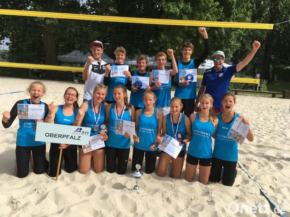 Die Oberpfälzer freuen sich über den Erfolg beim Bayernpokal Beach in Ingolstadt: Hinten von links: Paul Seidel (Auswahltrainer Mädels), Jonathan Helm (Amberg), Fabian Schwab, Lorenz Ponnath (beide Regenstauf), Simon Breinbauer (Weiden), Michi Brunner (Auswahltrainer Jungs). Vorne von links: Lisa Großmann (Amberg), Nicole Wagner (Schwandorf),Julia Polito (Hahnbach), Lotta Weiß (Weiden), Helena Drechsel (Weiden), Samira Winkler (Regenstauf), Jasmin Ziereis (Neutraubling) und Lucy Riß (Amberg).