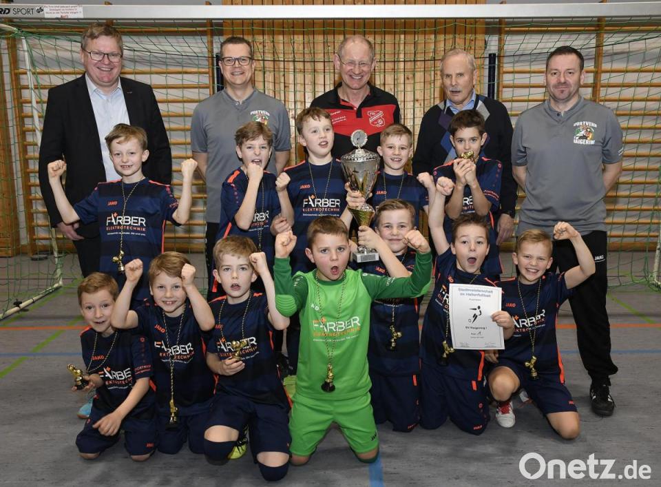 Oberbürgermeister Michael Cerny, der Vorsitzende des Stadtverbands für Sport, Norbert Fischer, und Albert Kiener vom FSV Gärbershof hoben bei der Siegerehrung die gute Nachwuchsarbeit der beteiligten Vereine hervor und überreichten allen Spielern goldene oder silberne Fußball-Schuhe zum Umhängen und dem SV Raigering den Wanderpokal.