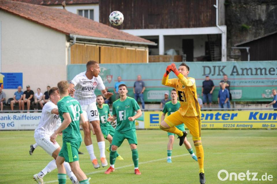 Die Ammerthaler machten hinten mit ihrem Zwillings-Innenverteidiger-Duo Marcel und Marco Kaiser dicht und waren frech nach vorne. Vor allem Raffael Kobrowski tat sich dabei hervor. „Wir müssten in der ersten Hälfte in Führung gehen“, haderte DJK-Coach Jürgen Schmid etwas mit der Chancenverwertung. Der Ex-Profi des SSV Jahn Regensburg sah einen Außenpfostenschuss von Kobrowski (27.) und eine Riesenchance von Giuliano Nyary, der an Friedsam aus kurzer Distanz scheiterte. Die Würzburger hatten nur Halbchancen. Den ehemaligen Zweitligatorjäger Saliou Sané hatte die DJK im Griff.