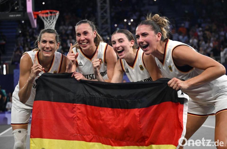 Fassungslos umarmten die vier Olympiasiegerinnen ihren Edelfan Dirk Nowitzki. Die 46 Jahre alte Ikone saß bei dem historischen deutschen Basketball-Moment in Paris in der ersten Reihe und gratulierte den sensationellen Goldgewinnerinnen im 3x3. Das Quartett Svenja Brunckhorst, Sonja Greinacher, Elisa Mevius und Marie Reichert hatte zuvor Spanien in einem packenden Finale mit 17:16 besiegt und damit auch die erste deutsche Olympia-Medaille im Basketball geholt.