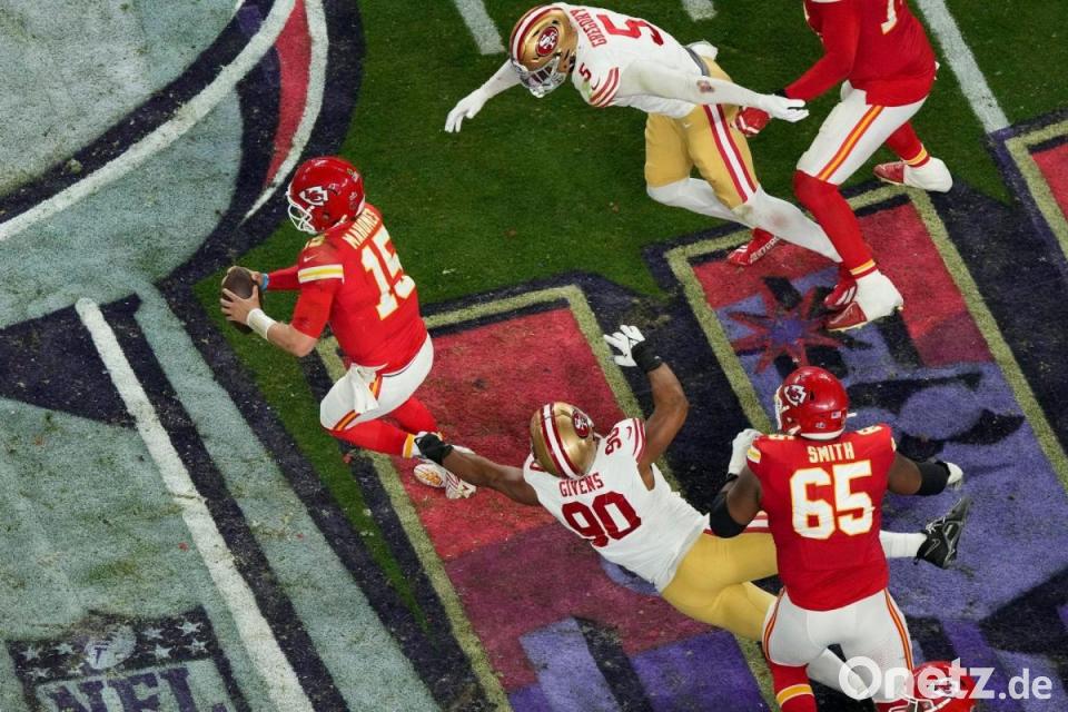 Nachdem Usher mit seinen Gästen Alicia Keys, H.E.R. sowie den Rapper Ludacris und Lil Jon fertig und die Bühne abgebaut war, patzten die Chiefs erneut. Erst fiel ein kurzer Rückpass von Mahomes auf Pacheco auf den Boden, dann warf der hochdekorierte Star-Quarterback beim nächsten Spielzug in die Hände eines 49ers-Verteidigers - das war ihm in den Playoffs 218 Pässe lang nicht mehr passiert.