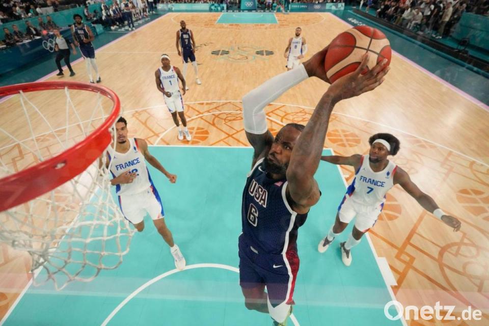 Die Basketball-Superstars der USA um Führungsspieler LeBron James haben das Olympia-Traumfinale gegen Gastgeber Frankreich gewonnen und sich das fünfte Gold in Serie gesichert. Vor 15.000 begeisterten Zuschauern - darunter auch Frankreichs Präsident Emmanuel Macron, Basketball-Größe Dirk Nowitzki und Schwimmstar Leon Marchand - setzte sich die mit zwölf NBA-Spielern gespickte Truppe von Trainer Steve Kerr in einer spektakulären Partie mit 98:87 (49:41) durch.