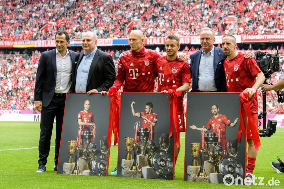 Rot-weiße Tränen flossen bereits vor dem Anstoß als Franck Ribéry, Arjen Robben und Rafinha unter tosendem Applaus und den Würdigungen der Bayern-Granden Uli Hoeneß, Karl-Heinz-Rummenigge und Hasan Salihamidzic verabschiedet wurden. In ihrem letzten Heimspiel im Münchener Trikot musste das Trio jedoch zunächst mit dem Platz auf der Bank Platz nehmen. "Was die beiden hier geleistet haben, war sensationell. Aber ich musste sportlich entscheiden", begründete Trainer Niko Kovac. Der in der Kritik stehende Meistertrainer wurde vom Bayern-Anhang immer wieder mit Sprechchören gefeiert. Nach Franz Beckenbauer ist er erst der zweite Trainer, der auch schon als Spieler mit den Bayern Meister wurde.