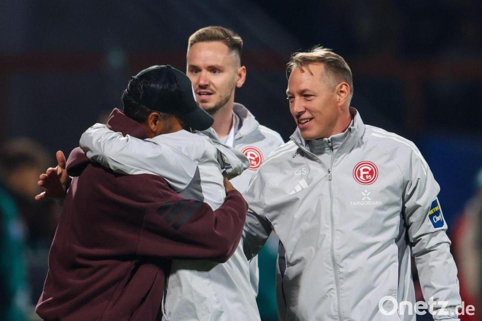 Als der Schlusspfiff ertönte, gab es kein Halten mehr. Der komplette Trainer- und Betreuerstab von Fortuna Düsseldorf sprang von der Bank auf und stürmte auf Trainer Daniel Thioune zu, um ihn zu umarmen. „Das war sehr emotional für mich. Ein überwältigender Moment“, sagte der 51-Jährige, dessen Mannschaft zuvor dank des Tors von Tim Oberdorf (4. Minute) beim VfL Bochum mit 1:0 gewonnen hatte. Ausgerechnet in Bochum.