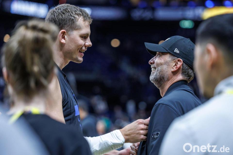 Franz Wagner sagte neben seinen deutschen Mitspielern an die Fans gerichtet: „Die letzten Tage hier waren unvergesslich, wir drei sind immer noch geflasht. Danke für die ganze Unterstützung, das wäre ohne euch nicht möglich. Eine Bitte habe ich: Lasst es richtig krachen heute.“
