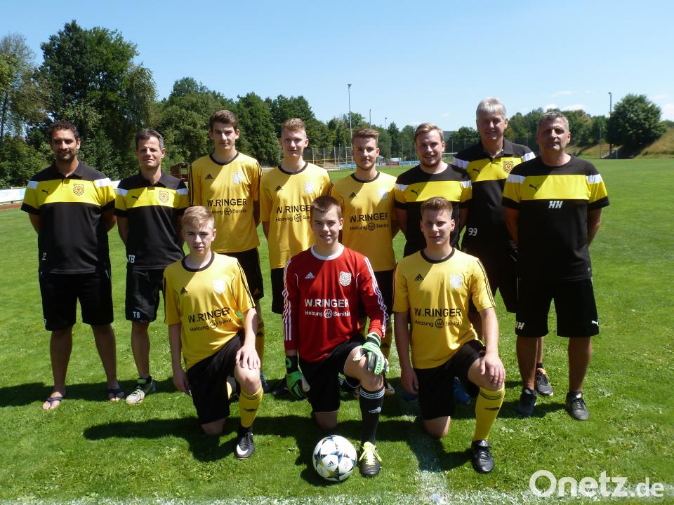 Torwarttrainer Johannes Wolf, Chefcoach Thorsten Baierlein, die Jugendspieler Johannes Dotzler, Tobias Meier, Benedikt Rauch, Co-Trainer Christoph Ertel, Abteilungsleiter Wolfgang Dotzler und der Trainer der zweiten Mannschaft, Helmut Hefner (hinten von links), Patrick Bönisch, Neuzugang Benedikt Dietrich und Martin Wawersig.