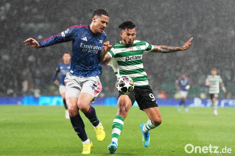 Im Regen von Lissabon wurden die auf Ballkontrolle fokussierten Gunners vom portugiesischen Double-Sieger zu Beginn mächtig unter Druck gesetzt. Das führte bereits in der 6. Minute zur ersten richtig dicken Möglichkeit durch Linksverteidiger Maxi Araújo, der bei seinem wuchtigen Abschluss von der Strafraumkante die Latte traf. Arsenals Keeper David Raya war noch mit den Fingerspitzen dran.