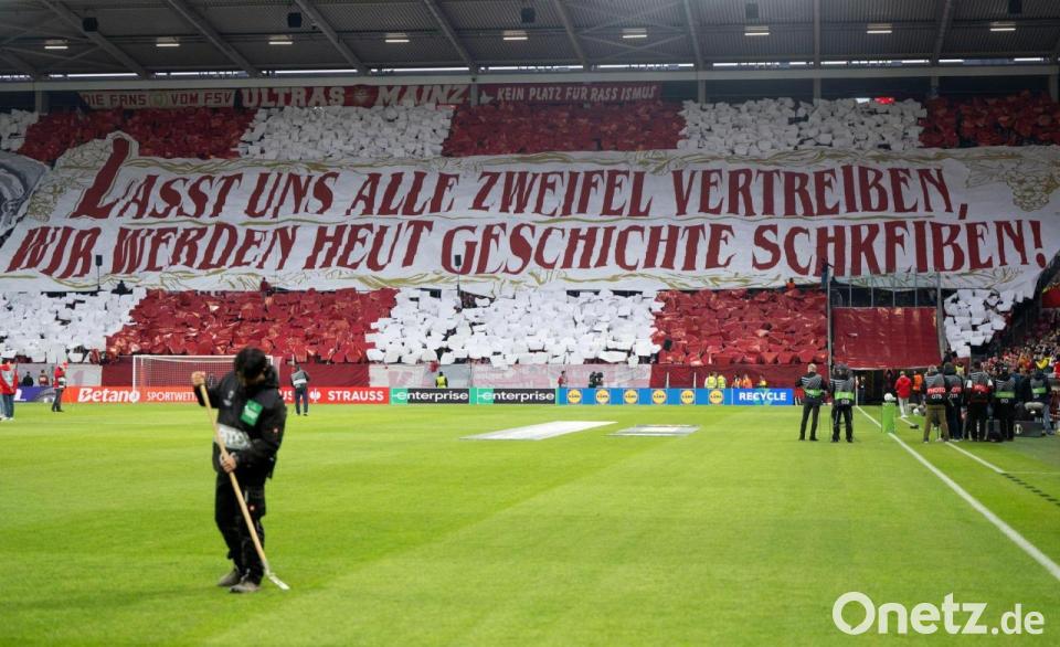 „Wir wissen, wir können heute etwas Großartiges erreichen, was es hier noch nie gab“, sagte der derzeit verletzte Mainzer Spielmacher Nadiem Amiri bei RTL+ vor der Partie und auch die Fans stimmten ihre Mannschaft mit einer großen Choreographie auf die große Chance ein. „Lasst uns alle Zweifel vertreiben, wir werden heut Geschichte schreiben“, lautete das Motto.