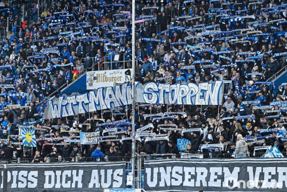 In der Südkurve hingen große Protestbanner gegen den Spieleragenten. Rund um das Sinsheimer Stadion hatte eine Ultra-Gruppe Flyer verteilt mit einem Fahndungsaufruf Wittmanns. „Wittmann stoppen“ hieß es auf zahlreichen in der ganzen Arena verteilten Plakaten - „Roger Wittmann, verpiss dich aus unserem Verein“ auf einem großen Spruchband.
