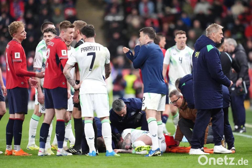 Nach dem heftigen Zusammenstoß mit einem Gegenspieler und der folgenden Bewusstlosigkeit gibt es bei Irlands Fußball-Nationalspieler Sammie Szmodics Entwarnung. Der irische Verband teilte mit, dass der 30-Jährige mit einer Kopfverletzung in ein Krankenhaus gebracht worden war, dies nach einer Beobachtungsphase aber wohlbehalten wieder verlassen habe.