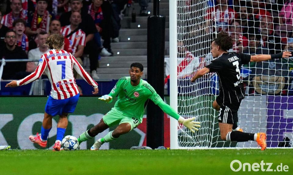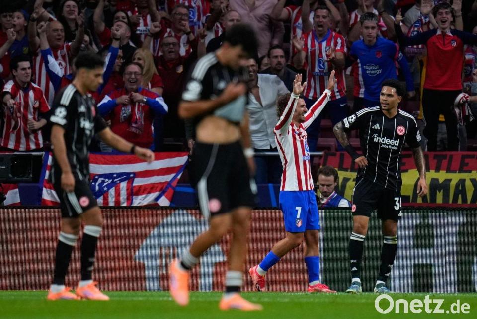 Deftige Pleite statt erneuter Fußball-Party: Eintracht Frankfurt hat das Gastspiel bei Atlético Madrid mit 1:5 (0:3) verloren und nach dem starken Auftakt einen herben Dämpfer in der Champions League kassiert. Giacomo Raspadori in der 4. Minute, Robin Le Normand (33.), Antoine Griezmann (45.+1), Giuliano Simeone (70.) und Julián Alvarez (82./Handelfmeter) erzielten die Tore für die in allen Belangen überlegenen Spanier, die dem Bundesligisten eine Königsklassen-Lektion erteilten.