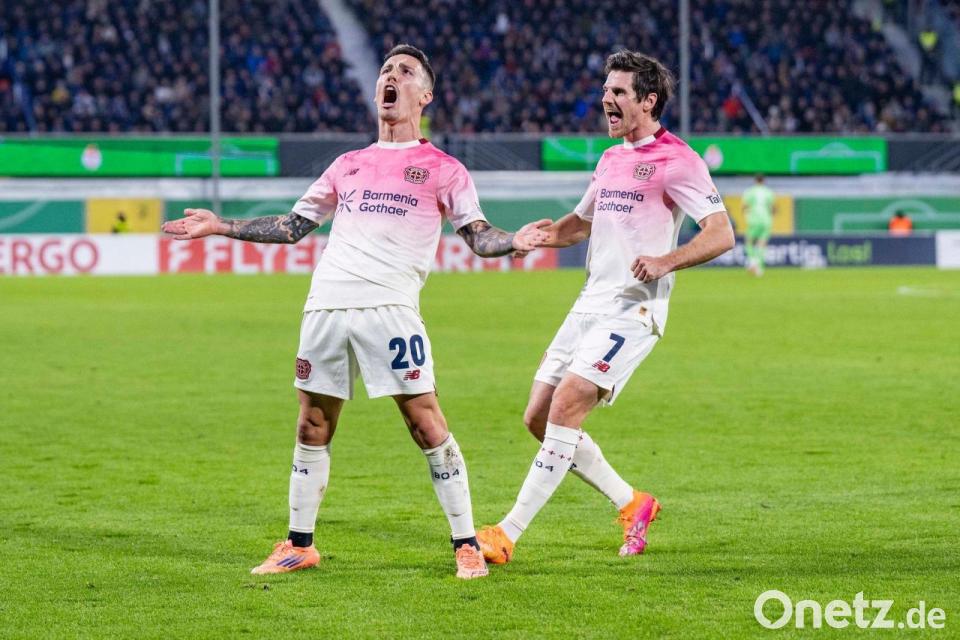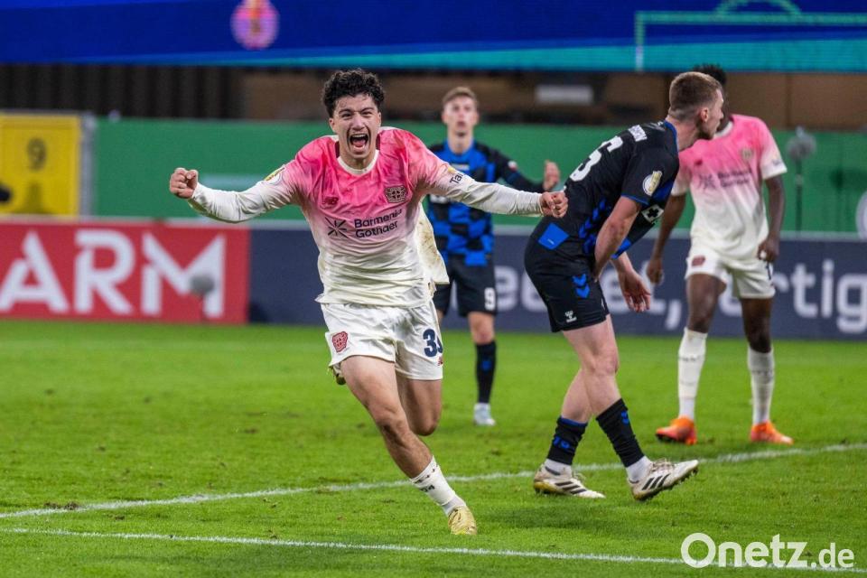 Bayer benötigte einen genialen Freistoß von Álex Grimaldo für den ersten Treffer (60.). Verursacht hatten den Freistoß die Notbremse von Götze, für die er vom Platz gestellt wurde. Stefano Marino köpfte die Gastgeber in der Nachspielzeit in die Verlängerung. Dort wurde es wild: Sven Michel traf erst zum 2:1 für die zehn Paderborner (96.). Dann drehten Jarell Quansah (105.+1), Ibrahim Maza (120.+2) und Aleix Garcia (120.+4) erneut die Partie.