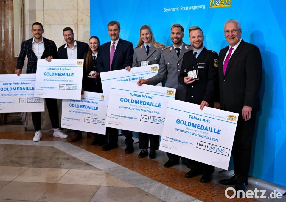 Mit dabei waren auch die Goldmedaillengewinner Tobias Arlt, Tobias Wendl, Dajana Eitberger, Magdalena Matschina, Georg Fleischhauer und Johannes Lochner. Den stolzen Siegern überreichte der CSU-Chef zudem noch fototaugliche Schecks. Je nach Art des Edelmetalls bekamen die Gewinner bis zu 30.000 Euro für eine Goldmedaille, 20.000 Euro für eine Silbermedaille und 10.000 Euro für die Bronzemedaille.