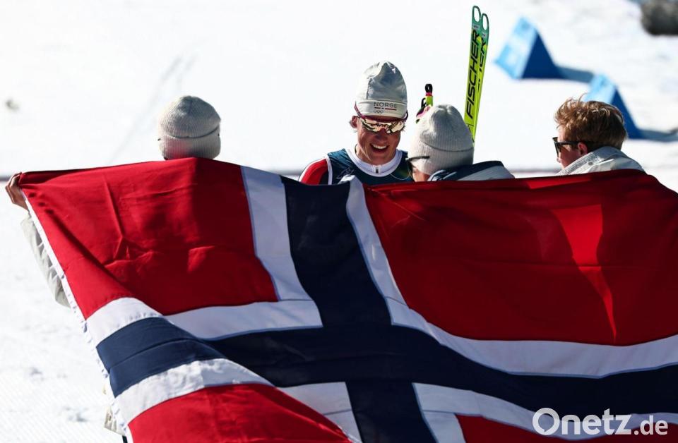 Lachend fiel Johannes Hoesflot Klaebo seinen begeisterten Teamkollegen in die Arme. Mit wehender norwegischer Fahne empfingen sie ihren Olympia-Rekordmann hinter der Ziellinie und feierten. Der Skilanglauf-Star siegte im italienischen Tesero auch mit der Staffel über 4 x 7,5 Kilometer und krönte sich zum erfolgreichsten Teilnehmer bei Winterspielen.