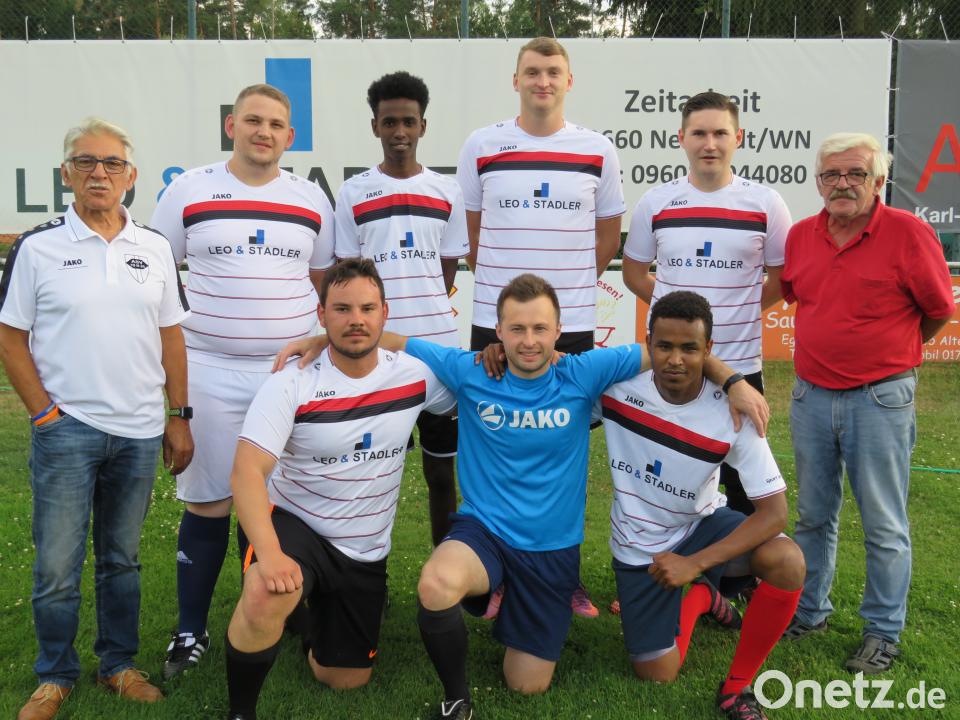 Der ASV Neustadt stellte seine neuen Spieler vor: (kniend von links) David Beck, Trainer Norbert Kraft und Mohammed Nur Khalid; (stehend von links) Vorsitzender Juan Vilas, Andreas Zeisser, Abdulla Ayub Jusuf, Vitczslav Iwaschenkow, Andreas Bertram und Abteilungsleiter Hans Wiesenbacher. Nicht auf dem Bild sind Artur Bertram und Andreas Rupprecht.