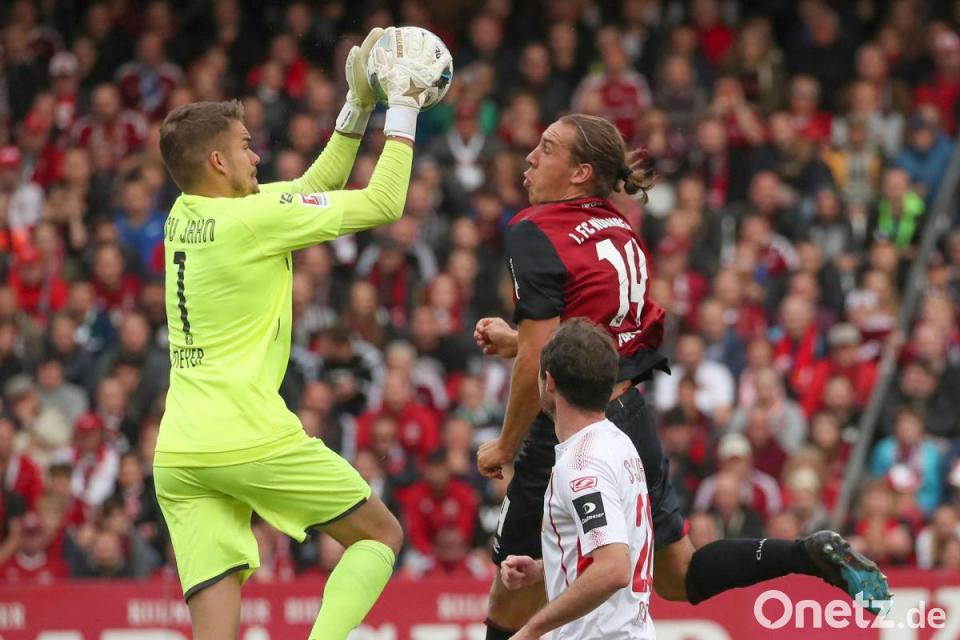 Niemand, aber wirklich niemand hatte diese Pointe beim fränkisch-oberpfälzischen Zweitliga-Derby mehr erwartet. In der Nachspielzeit - sein Team lag seit der 38. Minute mit 0:1 in Rückstand - machte sich Alexander Meyer, hauptberuflich Torhüter beim SSV Jahn Regensburg, mit auf in den Strafraum des 1. FC Nürnberg. Max Besuschkow brachte die Ecke nach innen, der Club klärte zunächst, doch Keeper Meyer schoss die Kugel artistisch mit dem Rücken zum Tor doch noch auf das Nürnberger Gehäuse. Club-Keeper Andreas Lukse lenkte die unangenehme Bogenlampe gerade noch über die Querlatte - nächste Ecke, wieder führte Besuschkow aus. Diesmal ging es Torwart Meyer offensiver an, er sprintete in den Ball am kurzen Pfosten, wuchtete den Kopfball an den zweiten Pfosten, wo Joker Jan-Marc Schneider nur mehr den Fuß hinzuhalten brauchte. 1:1 in der vierten Minute der Nachspielzeit, wenig später pfiff Schiedsrichter Patrick Alt die Partie ab. "Ich habe bisher nicht gewusst, dass ich einfach unseren Torhüter nach vorne beordern muss, damit wir endlich mal ein Standardtor erzielen", war ein glücklicher Jahn-Trainer Mersad Selimbegovic nach dem Derby zu Späßen aufgelegt. Ganz anders sah dies sein Nürnberger Pendant Damir Canadi: "Wir haben das 2:0 nicht nachgelegt. Wir müssen die Konter besser ausspielen. Wir sind sehr enttäuscht. Wir wollten in die Top 6."