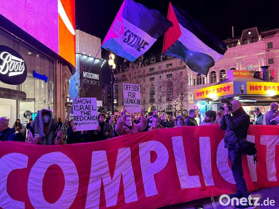 Vor der Auftaktveranstaltung für die EM 2028 in Großbritannien und Irland hat eine Gruppe Aktivisten auf dem berühmten Piccadilly Circus den Ausschluss Israels aus dem europäischen Fußball gefordert. Etwa 50 Menschen warfen der Europäischen Fußball-Union UEFA vor, Blut an den Händen zu haben. „Schande, UEFA“, riefen die Menschen, einige trugen Papiermasken mit dem Gesicht von UEFA-Präsident Aleksander Ceferin.