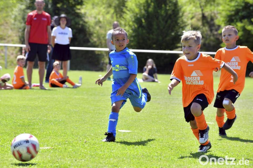 Szene aus dem Spiel bei den G-Junioren zwischen SV Raigering (blaue Trikots) und dem FSV Gärbershof (orange Trikots)