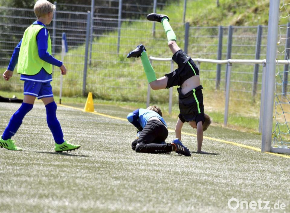 Notfalls mus die Abwehr mit einem Handstand erfolgen! Szene aus dem Spiel bei den E-Junioren zwischen dem SV Raigering (schwarze Trikots) und den "All Stars" (blaue Trikots mit Leibchen).