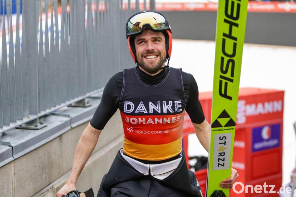 Mit ausgebreiteten Armen genoss Johannes Rydzek die Sektdusche im Ziel. Der zweimalige Olympiasieger hat seine beeindruckende Karriere als Nordischer Kombinierer mit einem achten Platz beim Weltcup-Finale in Oslo beendet. Teamkolleginnen und -kollegen sowie weitere Wegbegleiter herzten ihn ausgiebig.