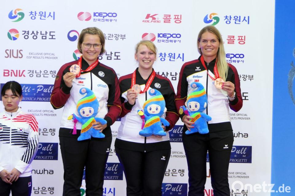 (dpa) Die deutschen Schützen haben bei der Weltmeisterschaft im südkoreanischen Changwon die erste Medaille gewonnen. Das Luftgewehr-Team mit Julia Simon aus Süß (Landkreis Amberg-Sulzbach), Isabella Straub, und Selina Gschwandtner kam am Montag auf den dritten Platz. Den Sieg holte sich Gastgeber Südkorea vor Indien. "Das ist natürlich super, wenn alle drei konstant hoch schießen und es für eine Medaille reicht", sagte die Münchenerin Gschwandtner.