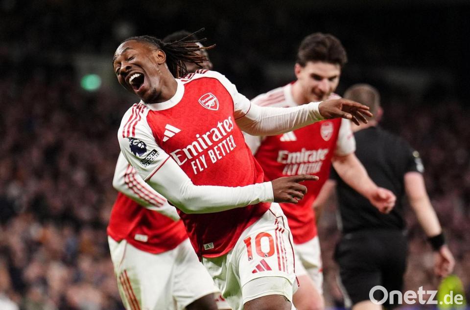 Der englische Fußball-Tabellenführer FC Arsenal hat das hitzige Duell beim Erzrivalen Tottenham Hotspur mit 3:1 (1:1) gewonnen und damit vorerst seine Spitzenposition in der Premier League behauptet. Mit zwei Toren war der einst von den Spurs umworbene Arsenal-Profi Eberechi Eze erneut der Matchwinner im Nordlondon-Derby. Bereits im Hinspiel hatte er dreimal getroffen.