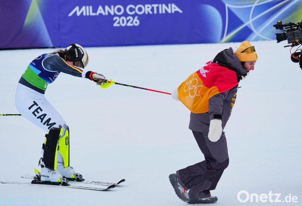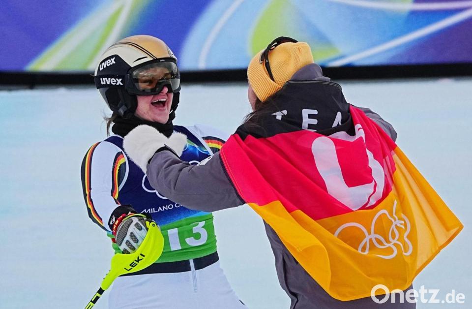 Kira Weidle-Winkelmann zog Emma Aicher erst am Skistock aus dem Zielraum und fiel ihr bei der Siegerehrung dann erleichtert um den Hals. Das deutsche Duo hat bei den Olympischen Winterspielen in Italien Silber in der Team-Kombination geholt. Für Aicher ist es bereits die zweite Medaille, nachdem sie auch in der Abfahrt am Sonntag zu Silber gerast war.