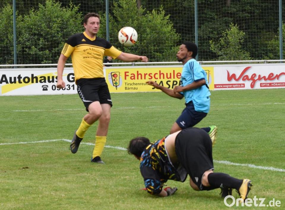 Das Stadtderby in der Kreisklasse Stiftland zwischen dem FC Tirschenreuth II und dem FSV Tirschenreuth war eine klare Sache für die Gastgeber. Die Bezirksliga-Reserve gewann zum Saisonauftakt im heimischen Sportpark klar mit 3:0. Schon zur Pause war die Entscheidung durch Tore von Elias Bader (9. Minute), Michael Gmeiner (34.) und Jan Bracke (40.) gefallen. Nach dem Seitenwechsel verwaltete der FC II souverän den Vorsprung. Der FSV war zwar stets um eine Resultatsverbesserung bemüht, blieb aber in Tornähe weitgehend ungefährlich. Das Bild zeigt FC-Akteur Florian Gleißner (gelbes Trikot) und Isaac Obiefule im Kampf um den Ball, am Boden FSV-Torwart Enrico Moller.