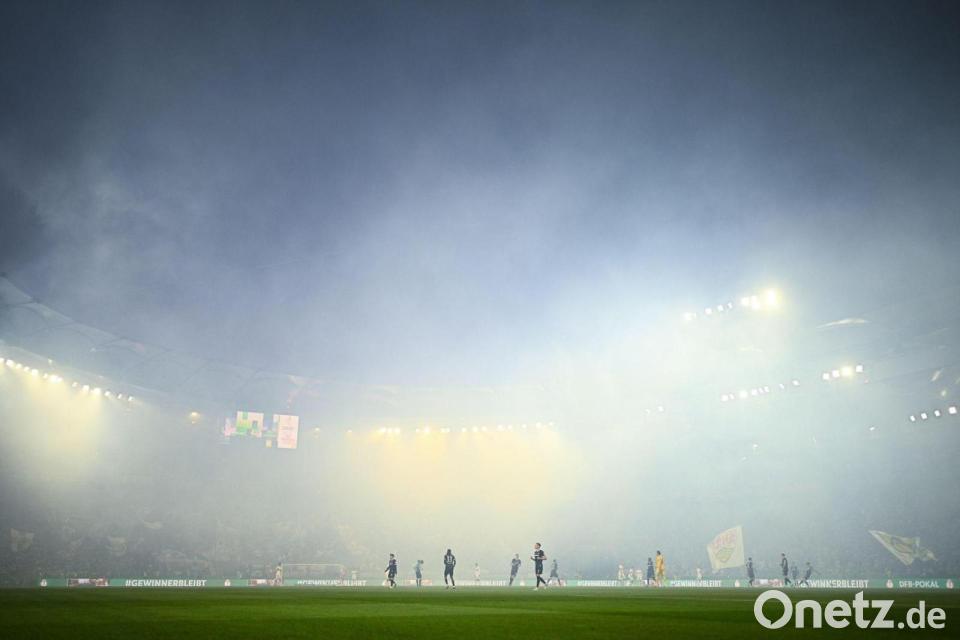 Nachdem die Fanlager die Teams eingestimmt hatten, verzögerte Rauch von der rot leuchtenden Pyrotechnik auf VfB-Seite den Anpfiff um wenige Minuten. Auf dem Rasen begann die Partie hitzig. Nach einer guten Viertelstunde hatten sich vier Spieler - je zwei auf jeder Seite - Gelbe Karten abgeholt.