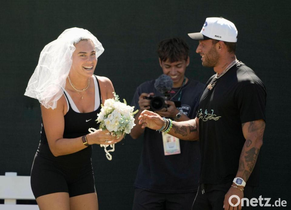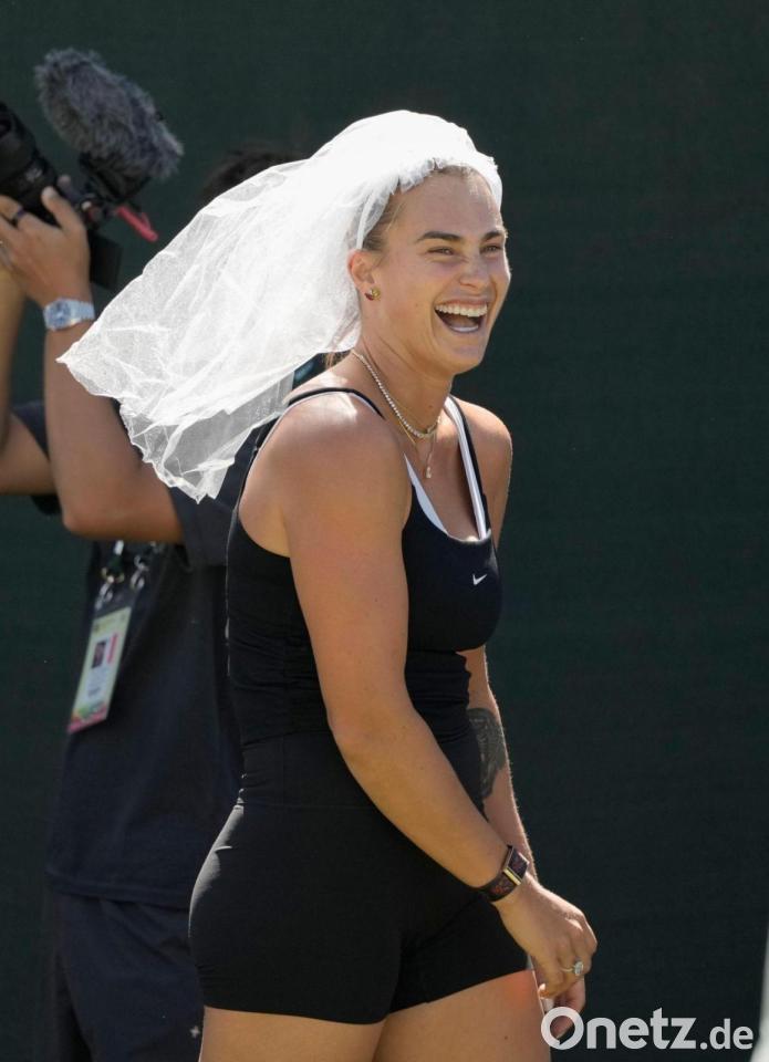 Nach ihrer Verlobung hat sich Tennisstar Aryna Sabalenka nun mit einem Brautschleier gezeigt - allerdings nicht vor dem Altar, sondern auf dem Trainingsplatz. Den Schleier, den ihr offenbar ein Fan zugeworfen hatte, setzte sich die belarussische Weltranglisten-Erste auf den Kopf, und sie nahm auch einen kleinen Blumenstrauß in die Hände. Ihr Verlobter Georgios Frangulis lächelte neben ihr.