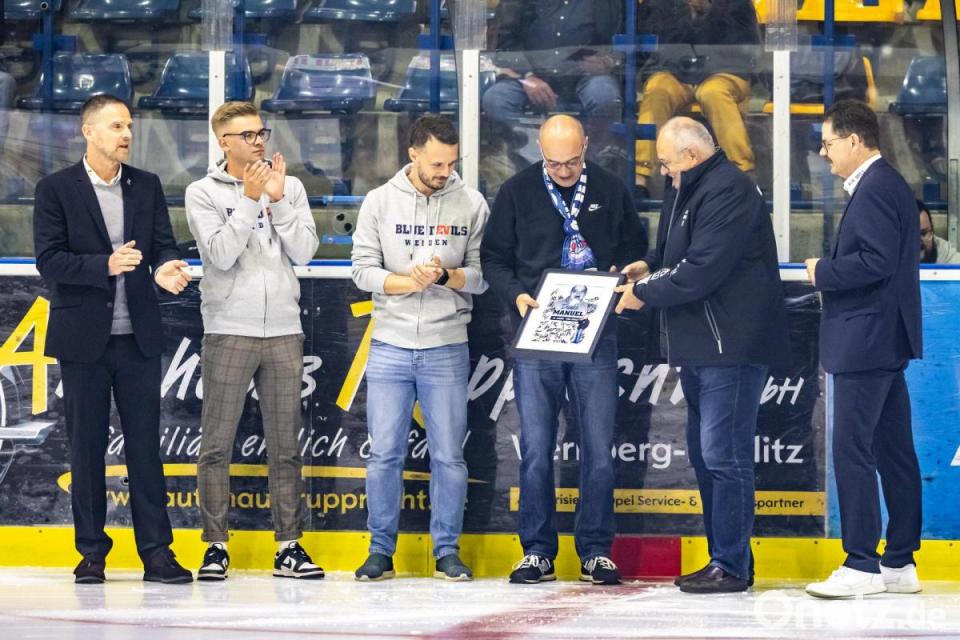 Die Blue Devils Weiden haben ihren ehemaligen Stadionsprecher "The Voice" Manuel Stöckl vor dem ersten Saisonspiel in der Oberliga Süd gegen den EC Peiting verabschiedet. Stöckl war die letzten 15 Jahre die Stimme des 1. EV Weiden und der Blue Devils.