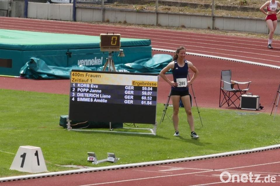 Für Eva Korb (TB Weiden) war die Teilnahme an den süddeutschen Leichtathletik-Meisterschaften in Ludwigshafen der Saisonhöhepunkt. Sie startete in ihrer Paradedisziplin, dem 400 Meter-Lauf. Im starken Teilnehmerfeld von 15 Damen war sie auf Rang zwölf gemeldet. Bei perfekten Rahmenbedingungen und auf ihrer Lieblingsbahn drei ging sie im ersten von drei Zeitläufen an den Start. Nach einem starken Start übernahm sie am Ende der ersten Kurve die Führung. Auf den finalen 30 Metern entwickelte sich ein spannendes Duell zwischen Korb und Janne Popp von der LAC Quelle Fürth auf Bahn vier. Mit einem Vorsprung von drei Hundertstelsekunden überquerte die Weidenerin als Erste die Ziellinie. Sie stellte mit 59,04 Sekunden eine neue persönliche Bestzeit auf und steigerte sich um zwei Zehntelsekunden. In der Gesamtwertung der Frauen gelang ihr mit Platz sieben der Sprung unter die Top-Ten.