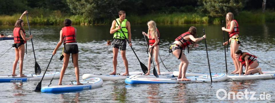 Wie zum Beispiel die Basketballerinnen der DJK Neustadt. Nachdem die Neustädter Damenmannschaft vergangene Woche bereits erste Gehversuche auf den SuP-Boards unternommen hatte, war nun das U14-Team am Montagabend im Badeweiher in Weiherhammer an der Reihe. Zwar war das Aufpumpen der Bretter etwas mühselig, die Einweisung durch DJK-Jugendreferent Simon Stachewski dafür aber um so kurzweiliger. Nach einigen Minuten auf dem Wasser beherrschten fast alle die nötige Technik zum Paddeln.