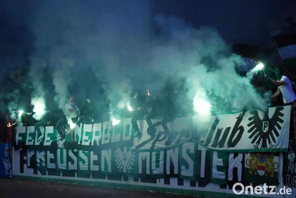 Anstoß. Ich muss gestehen, vom genauen Spielverlauf habe ich nicht viel mitbekommen. Viel zu abgelenkt war ich von den Preußen-Ultra-Fans, die nur wenige Meter neben uns ihre Fangesänge grölten, die riesigen Fahnen schwenkten und Bengalos zündeten. Eine Freundin klärte mich auf: Die Choreografien sind einstudiert, ein Vorsänger leitet die Menge mit einem Megafon an. Dabei sitzt er mit dem Rücken zum Spiel. Moment: Er sitzt mit dem Rücken zum Spiel? Viel mitbekommen tut er dann wohl auch nicht.