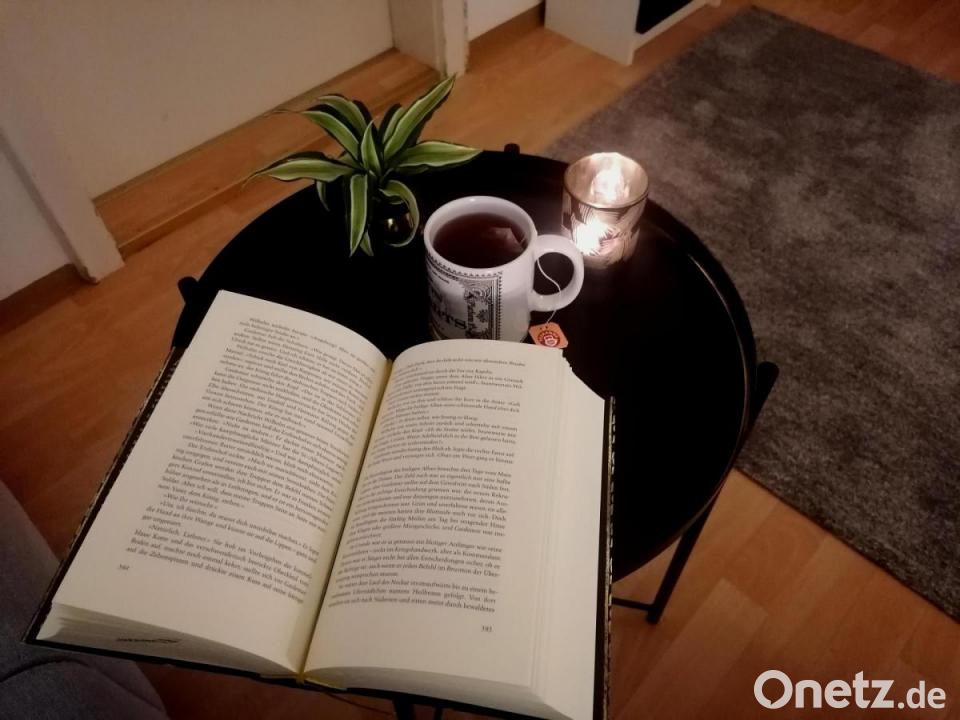 Den Rest des Abends sitze ich auf meiner Couch. Ich mache es mir mit meiner Kuscheldecke gemütlich. Im ganzen Wohnzimmer werfen die Teelichter Schatten an die Wände. Aber sie wirken nicht bedrohlich. Sie wirken beruhigend. Auf dem kleinen Beistelltisch neben der Couch steht eine Tasse Tee. Es ist mein Lieblingstee. Er schmeckt nach Apfel und nach Karamell. Er schmeckt wie ein Apfelkuchen. Schluck für Schluck begleitet er mich in ein neues Abenteuer, dass die Romanfigur in meinem Buch erlebt. Für einige Stunden sitze ich nur da, trinke den warmen Tee und verliere mich in den Seiten meines Buchs. Einen schöneren Abend könnte es für mich nicht geben.