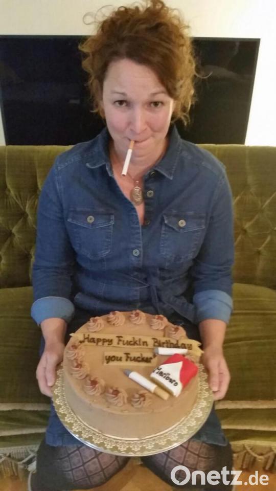 Fast ein viertel Jahrhundert später feierte ich 40. Geburtstag. Guns N' Roses kehrten 20 Jahre nach ihrer Auflösung plötzlich wieder vereint zurück ins Rampenlicht. Kurz vor Beginn meiner Geburtstagsfeier klingelte es an der Haustür. Ein Mitarbeiter einer Weidener Konditorei überreichte mir eine Schachtel. Darin ein Schokokuchen mit Marzipan-Zigaretten und eben jenem Spruch. Meine Freundinnen hatten ihn aus der Ferne bestellt. Ich hätte so gerne dabei Mäuschen gespielt! Wieder ließ ich mich in der Rocker-Pose ablichten, als Vorher-Nachher-Vergleich zum Bild aus der Jugend.