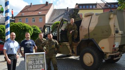"Wir suchen keine Götter in Weiß sondern Helden in Grün": Der Spruch soll auf die Arbeit der Sanitäter bei der Bundeswehr aufmerksam machen. Die "Bürger in Uniform" hielten mit dem Patrouillenfahrzeug "Dingo 2" und einem begehbaren Infomobil auf dem Marktplatz vor dem …