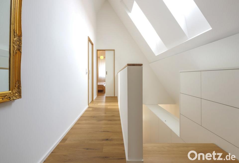 "Das neue Nutzungskonzept schafft Wohn- und Arbeitsfläche, vor allem aber bereits die Flexibilität für späteres integriertes Seniorenwohnen", erzählt der Architekt. Das zentrale Treppenhaus wurde durch den ins Lichtauge eingebauten dreigeschossigen Schrank als großer Stauraum für alle Räume entwickelt. Durch die integrierten Sitzmöglichkeiten erhält es gleichzeitig eine zusätzliche Wohnfunktion.