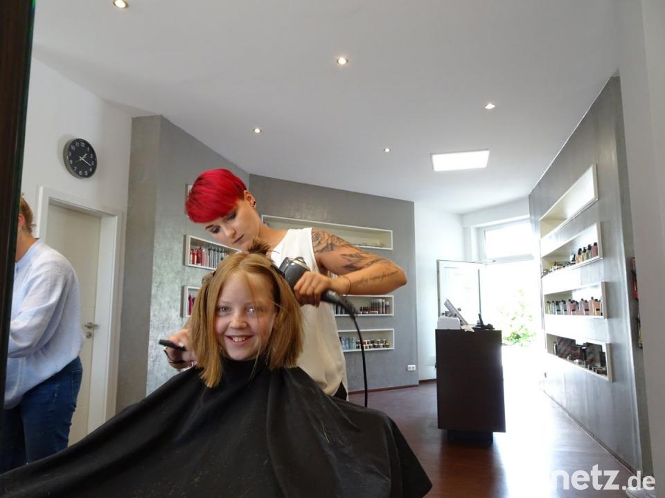 Zurück auf den Friseurstuhl: Trotz eines "leicht komischen Gefühls" nimmt Klara Platz. Und dann geht es ganz schnell. "N-Joy"-Chefin Michelle Siegel setzt die Schere an und mit einem Schnitt hat sie einen 35 Zentimeter langen Haarzopf in der Hand. Dann folgen die Feinarbeiten für die neue Bob-Frisur.