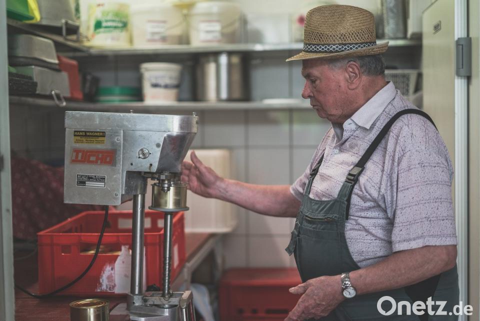 Viele Sorten, die die Schönbergers servieren, gibt es auch eingedost zum Mitnehmen. Statt in den Darm streicht Matthias das Brät dafür in die Metallbehälter, Renate legt den Deckel drauf und trägt sie in den Nebenraum. Dort verschließt Ernst Dose für Dose auf einer Maschine mit Fußschalter und drehenden Scheiben. Gegen Ende des Tages werden sie im Kessel gekocht.