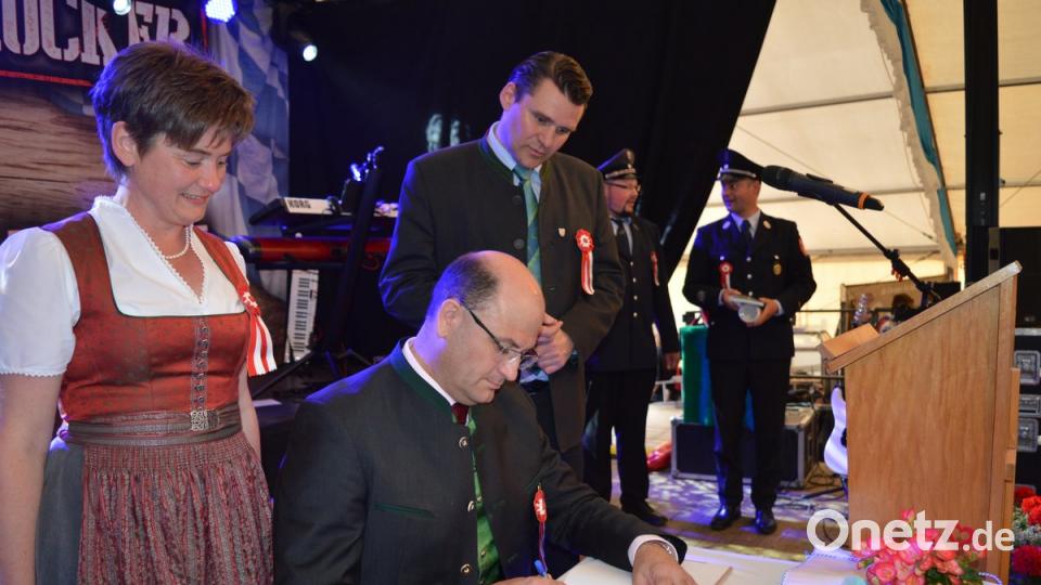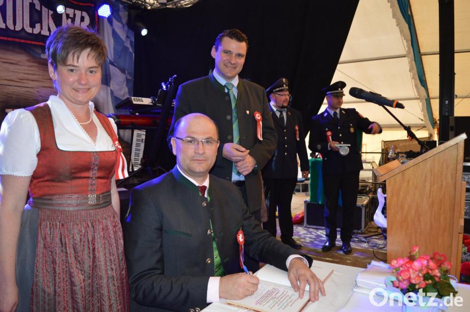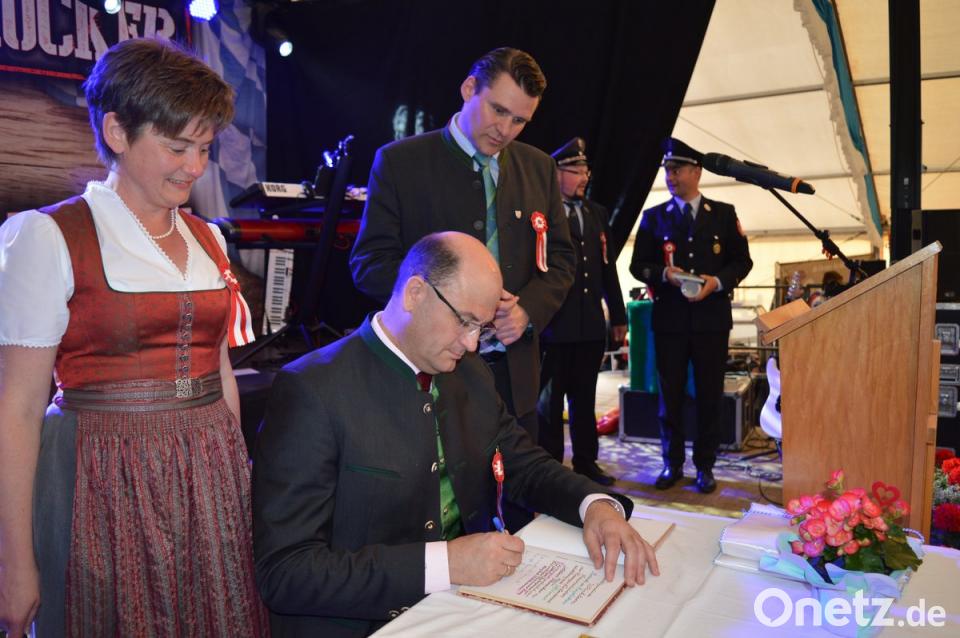 "Dieses Wochenende wird in die Geschichte von Haag eingehen", freute sich Füracker über den "Kraftakt", den die kleine Ortschaft bewältigt hatte um ein Fest dieser Größenordnung auf die Beine zu stellen. Er dankte für die Einladung und überreichte als Erinnerungsgeschenk eine Standarte für die Vereinsfahne. Schließlich dirigierte er noch den Bayerischen Defiliermarsch, ehe er sich im Goldenen Buch der Marktgemeinde verewigte. Bürgermeisterin Sonja Meier überreichte zur Erinnerung das Winklarner Wappen.